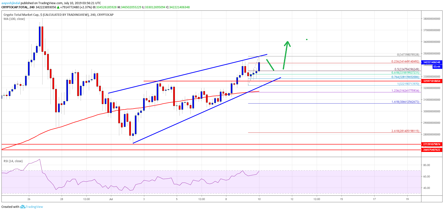 Looking at the total cryptocurrency market cap hourly chart, there was a strong upward move above the $325.0B and $330.0B resistance levels. The market cap even broke the $340.0B level and it recently climbed towards $348.0B. It seems like the market cap is following a nice bullish path and it may perhaps climb above the $350.0B resistance area. On the downside, there are many supports near the $335.0B and $332.0B levels. Only a close below the $330.0B level might push bitcoin, Ethereum, EOS, litecoin, ripple, binance coin, BCH, TRX, XMR, XLM and other altcoins lower in the near term.