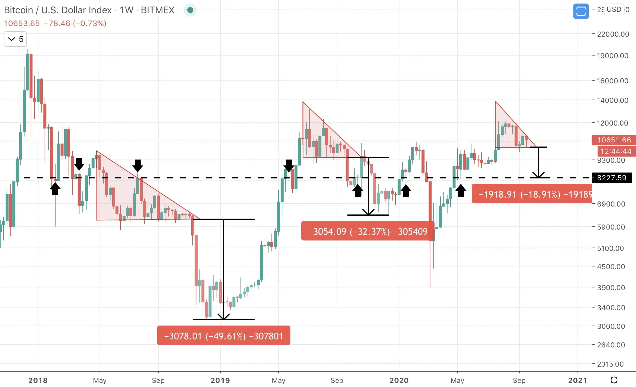 The most recent descending triangle took place after Bitcoin price ran headfirst into $13,800. Lower highs eventually led to a lower low, and a downtrend climaxing on Black Thursday this March.