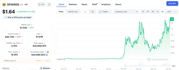 根據 CoinMarketCap 整理的數據,自 2023 年 8 月 18 日上線以來,迷因幣 SPX6900 的總回報率高達 56,884,287%。