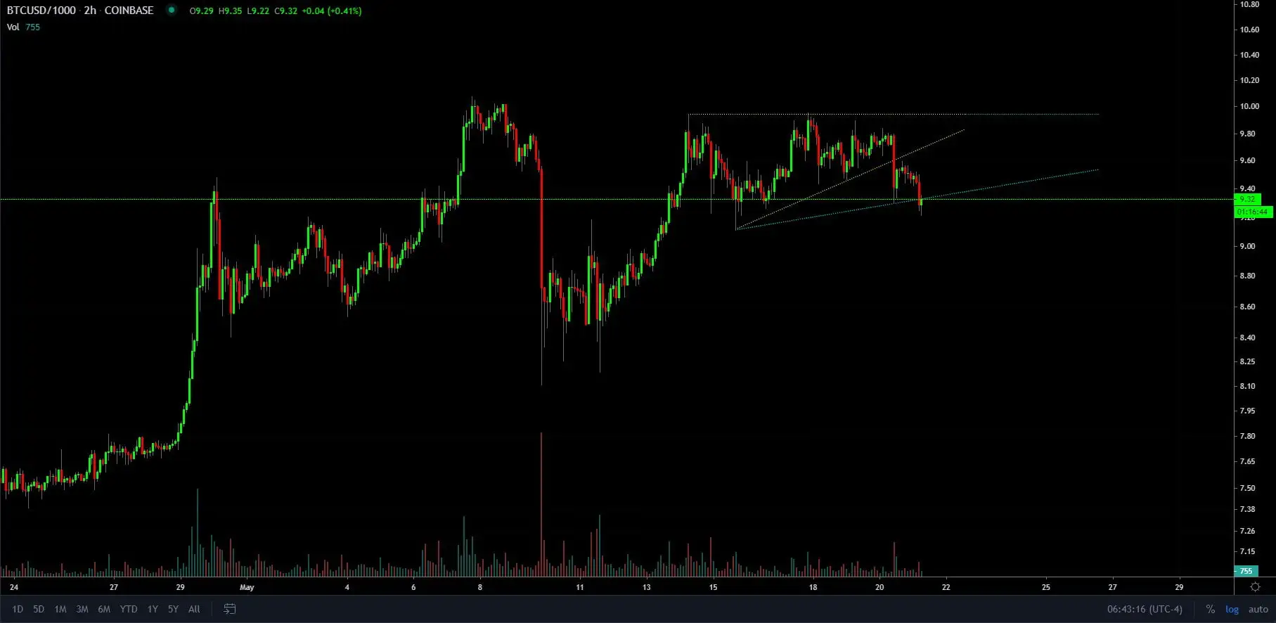 “I don’t like this extra-low rollover we just got,” he tweeted on Thursday. “I will let this play out to a lower low under ~$9120 before officially declaring it dead, but we don’t really have the solid uptrend I’d like for an ascending triangle any longer at this point.”