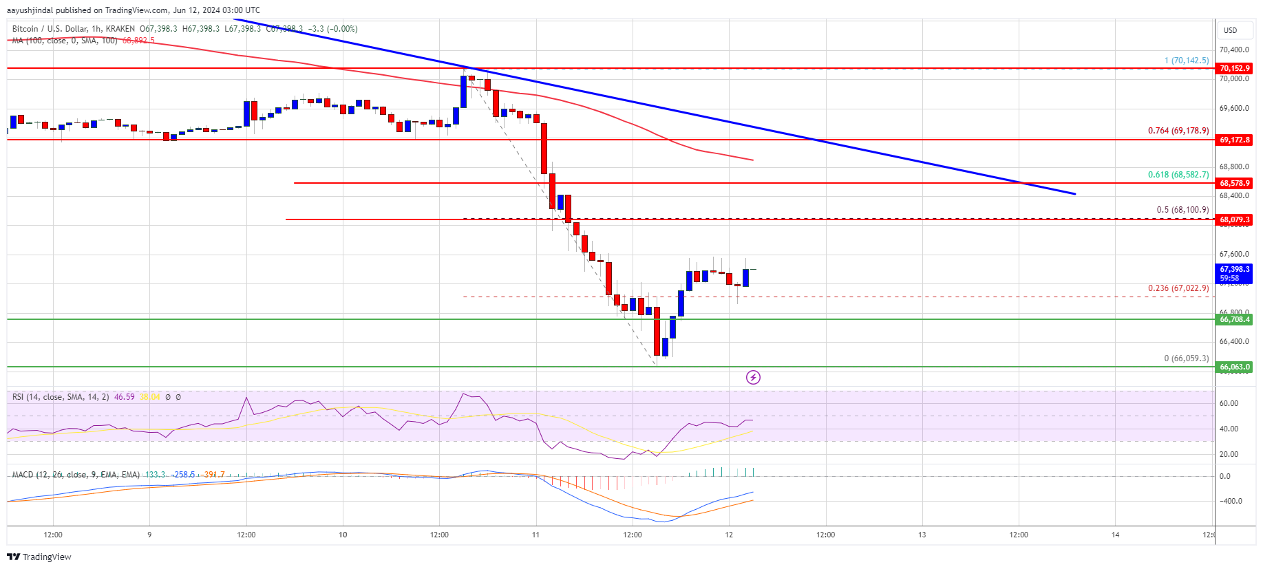 The price tested the $66,000 zone. A low was formed at $66,059 and the price is now consolidating losses above the 23.6% Fib retracement level of the downward move from the $70,143 swing high to the $66,059 low. Bitcoin is now trading below $68,500 and the 100 hourly Simple moving average.