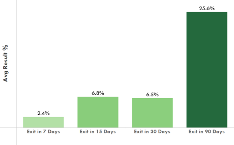 While a gain of over 18% in such a brief time period may lead some traders to lean bearish, the data suggests otherwise, with historical average results clearly positive across the board for all holding times from 2011 to the present.