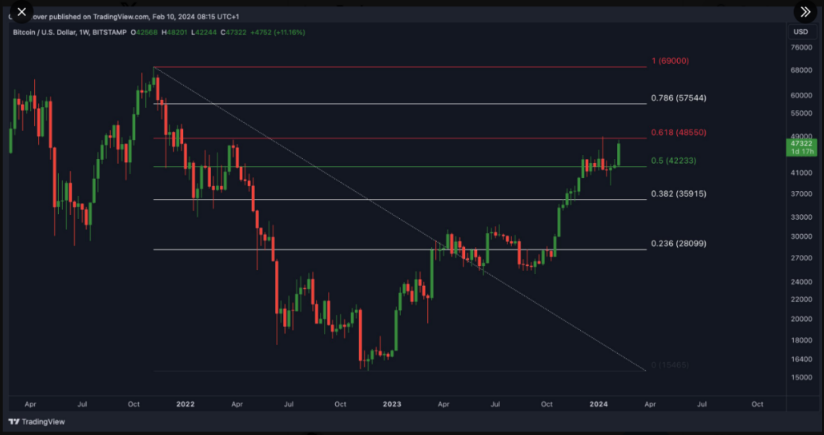 Prominent crypto analysts and market experts have offered their predictions for Bitcoin’s price trajectory in 2024. Crypto Rover, a renowned market analyst, believes that Bitcoin could embark on a bullish trend if it surpasses the $48,500 resistance level and reaches the 0.618 Fibonacci level.
