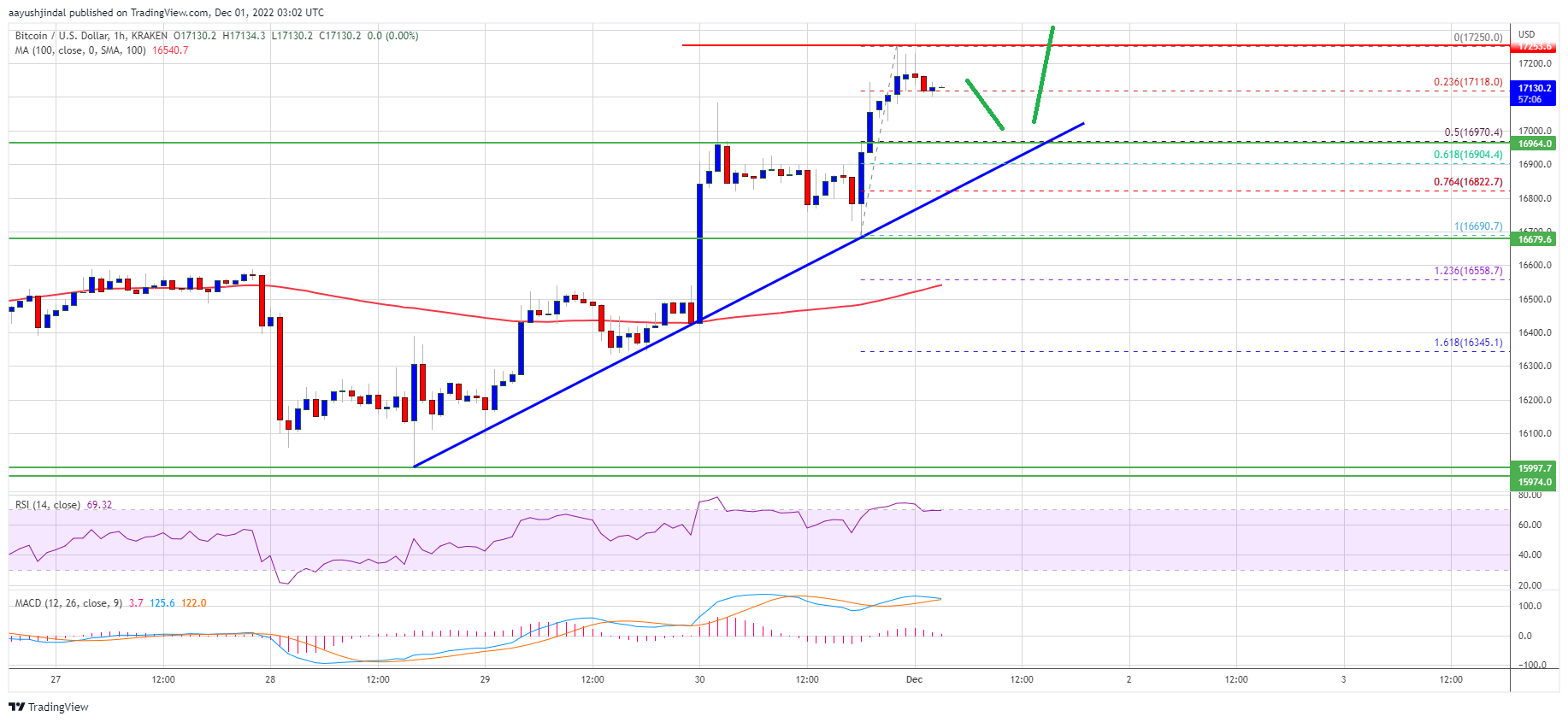 Bitcoin price is now trading above $16,800 and the 100 hourly simple moving average. There is also a key bullish trend line forming with support near $16,950 on the hourly chart of the BTC/USD pair.