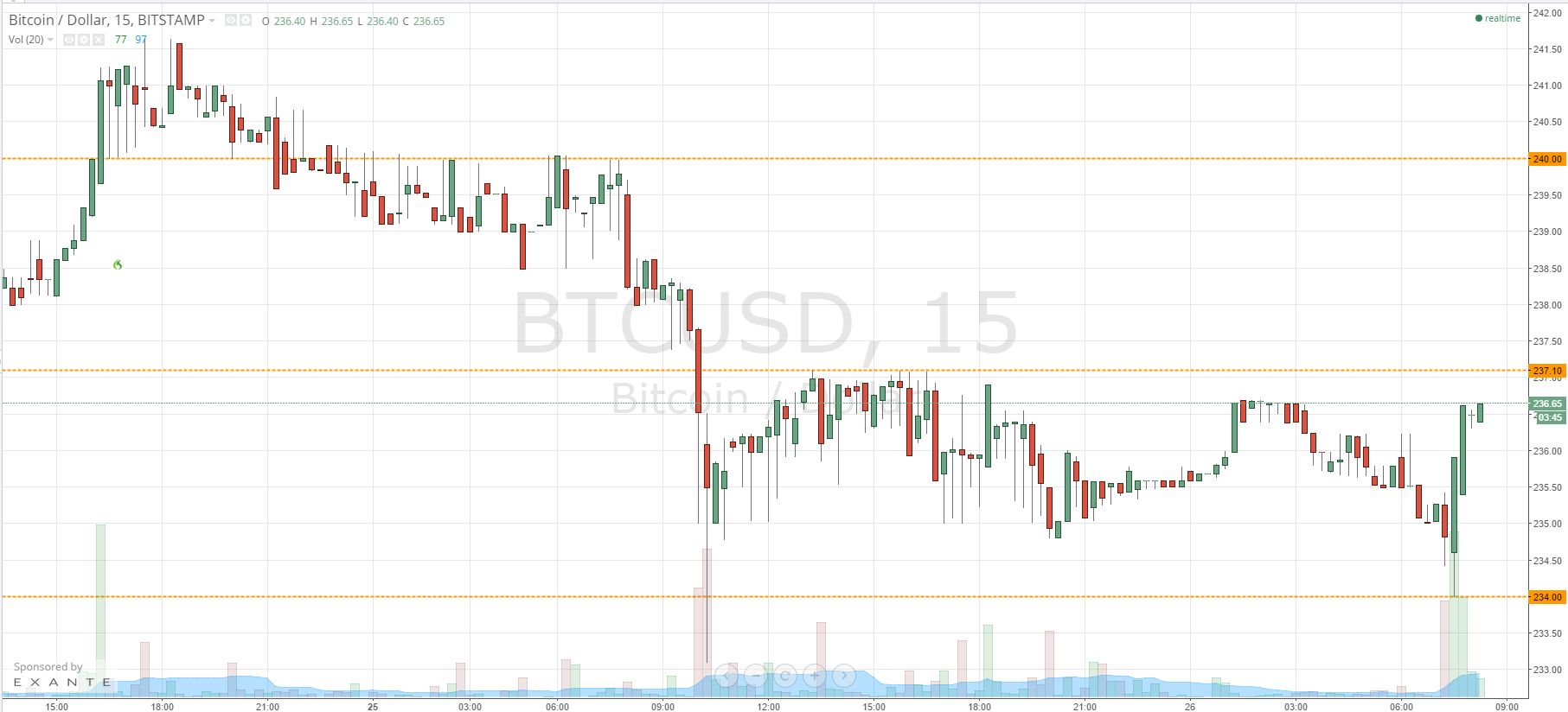 As the chart shows, after yesterday’s sharp decline through in term support at 237.10, the bitcoin price has traded relatively flat for 24 hours or so. Overnight last night, and as we head into this morning, the levels that we are keeping an eye on our 234 flat to the downside (in term support) and 237.10 to the upside (now serving as in term resistance post break).