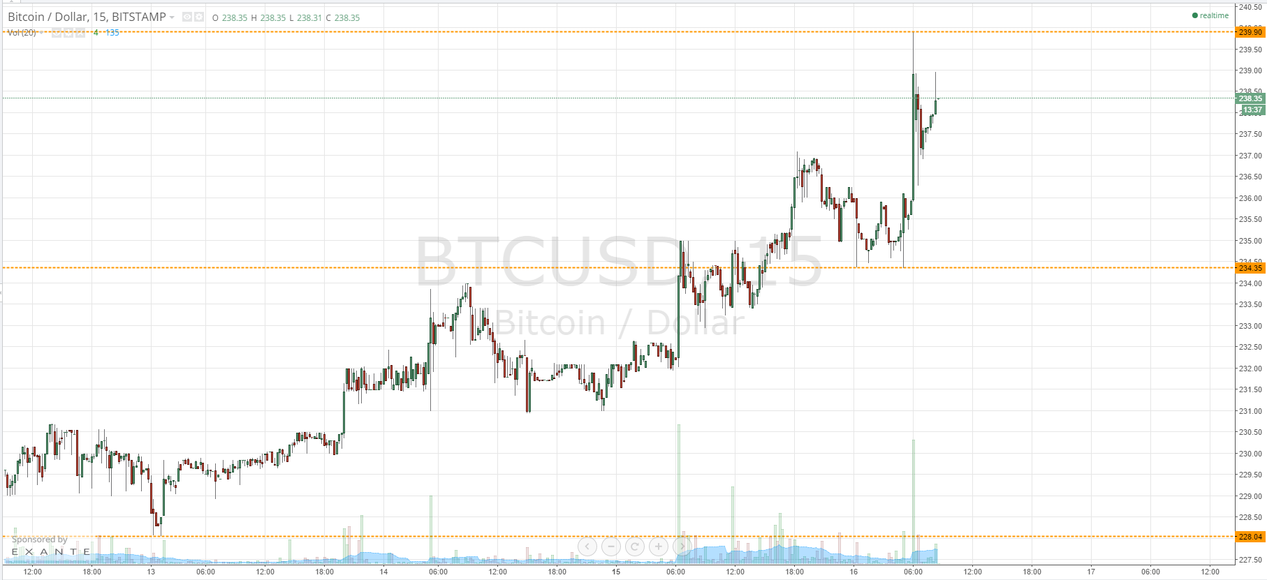 As the chart shows, we got some bullish momentum throughout the night, and – a little earlier this morning – saw a kick in the bitcoin price to reach what now serves as in term resistance at 239.90. This is the level to watch to the upside this morning. To the downside, we are looking at 234.35 as in term support.
