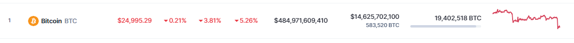 At the time of writing, Bitcoin was trading at $24,995, down 3.8% in the last 24 hours, data from crypto market tracker CoinMarketCap shows. BTC has now lost 5.26% of its value in the last seven days. Crypto assets may be particularly vulnerable to the central bank’s projection of a higher terminal rate later this year.