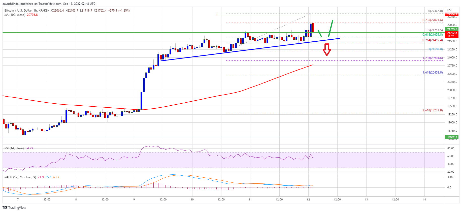 The price even surpassed the $21,500 resistance and spiked above the $22,000 resistance. A high was formed near $22,347 and the price recently started a downside correction. There was a move below the $22,000 and $21,850 levels.