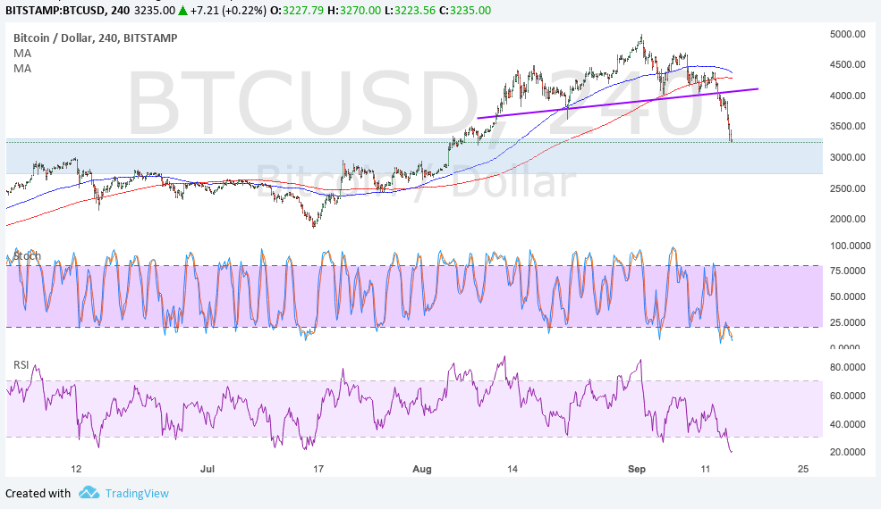 If the area of interest around $2500 to $3000 holds as support, price could still pull back to the broken neckline support near the moving averages before resuming its drop. The reversal formation is approximately $1000 tall so the selloff is likely to last until $3000.