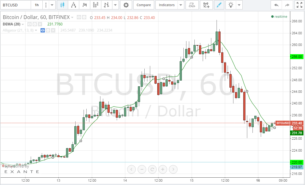 By looking at the 1 hour Bitfinex (BTC/USD) chart from tradingview.com and plotting the 20 day EMA on top of the chart, we can see how bitcoin price exhibited a rather steep drop from $268.34 to around $228.45 today. The bearish wave seems to be gaining strength as shown by the 7 successive red bearish candlesticks on the 1 hour chart. Also, the price has been trading below the 20 day EMA during most of today’s trading sessions. However, this downtrend lost momentum as the price approached the $220 support level, so the upcoming hours will decide whether $220 can prevent further price drop, or bitcoin price would test the $200 support level soon.