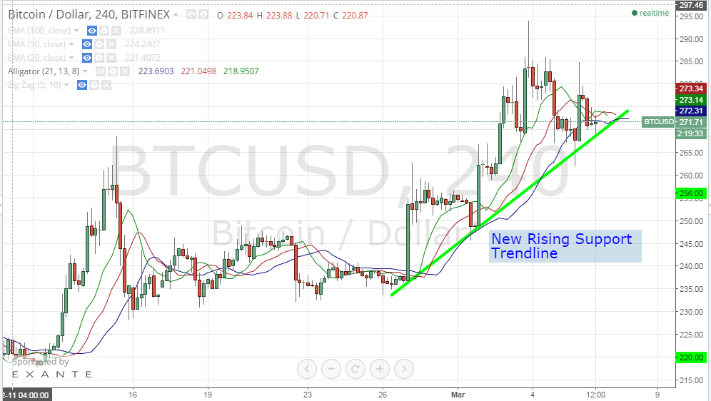Bitcoin price resumed rising yesterday to print a high of $285. Our technical analysis is in favor of a further rise in bitcoin price within the next 48 hours.