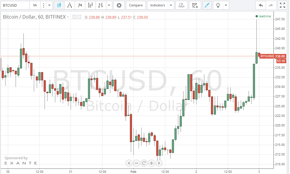 Bitcoin price resumed increasing today, reaching a high of $247 as the market’s trading volume is higher than yesterday’s. As the bullish wave is building up, we can soon see the price heading up to $300 as soon as the $256 resistance level is broken.