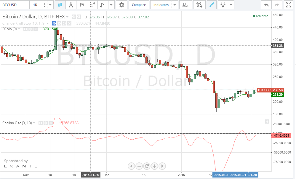 According to our previous analyses, it is clear how we can see the bitcoin price advancing to $300 as soon as the $256 resistance level is broken. We will use the Chaikin Oscillator to anticipate a growing bullish momentum by measuring the difference between the Accumulation Distribution Line of the 3 day EMA and the Accumulation Distribution Line of the 10 day EMA. By calculating the (3, 10) Chaikin Oscillator for the 1 day Bitfinex (BTC/USD) charts (look at the below chart), we can notice that the oscillator’s value is in the negative territory; However, the oscillator’s curve is sloping upwards and is likely to cross over to the positive territory soon. A positive Chaikin Oscillator denotes a prevailing buying market power for the bitcoin price market.