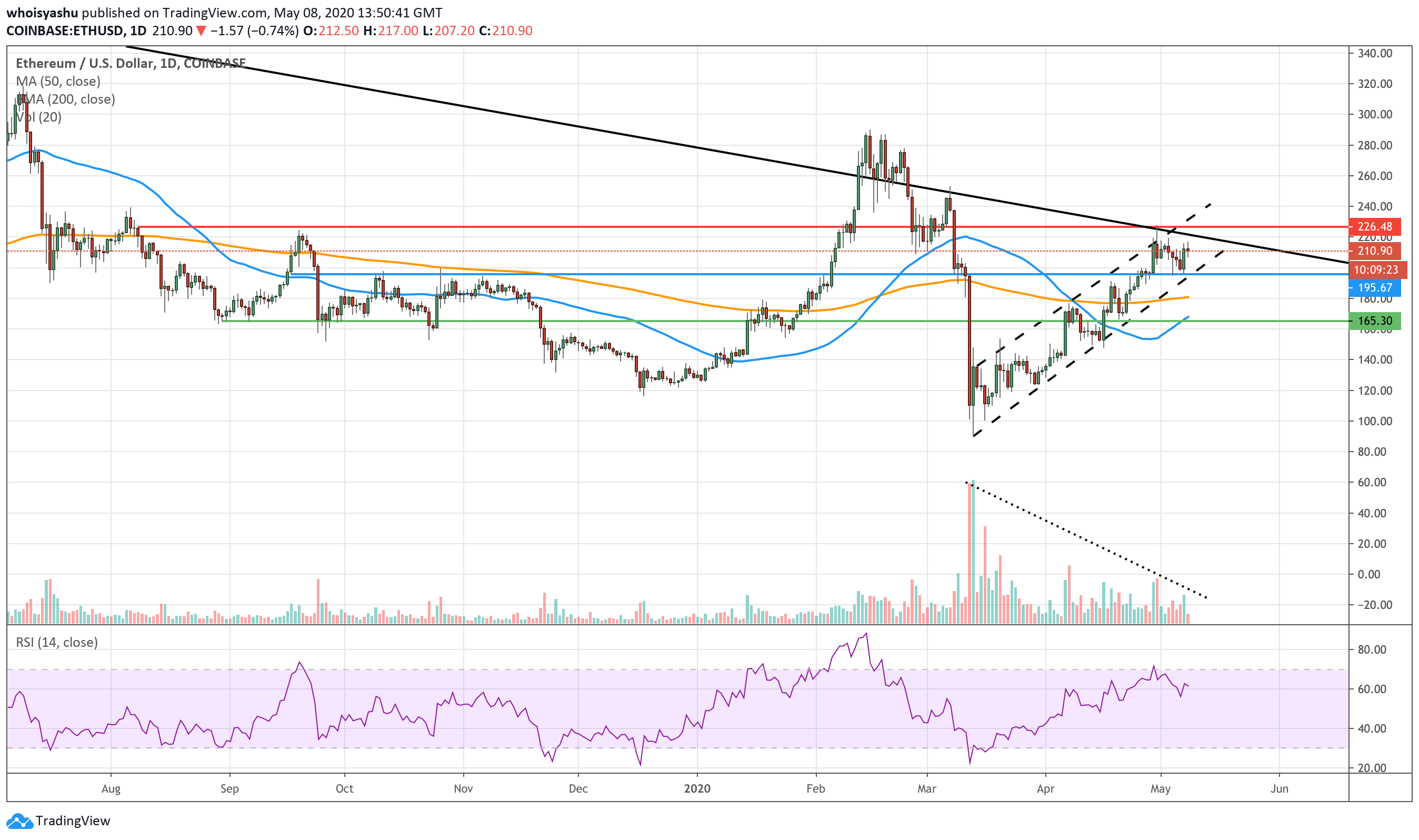 That correlation puts Ethereum en route to its April high near $226. The ETH/USD exchange rate could tail bitcoin amidst its pre-halving FOMO to hit the said target – that appears like a decent long trade opportunity. Nevertheless, if bitcoin corrects any deeper, it could also lead ETH/USD down towards $195.