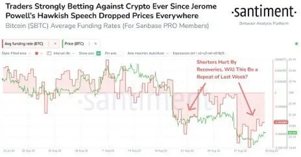 The cryptocurrency analytics company Santiment, which published the following chart displaying the increase in BTC average funding rates, revealed that the sentiment against Bitcoin is still unfavorable.