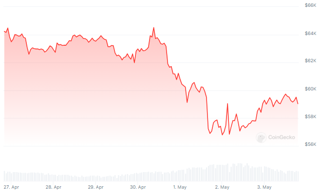 BTCUSD trading at $59,167 on the daily chart: TradingView.com