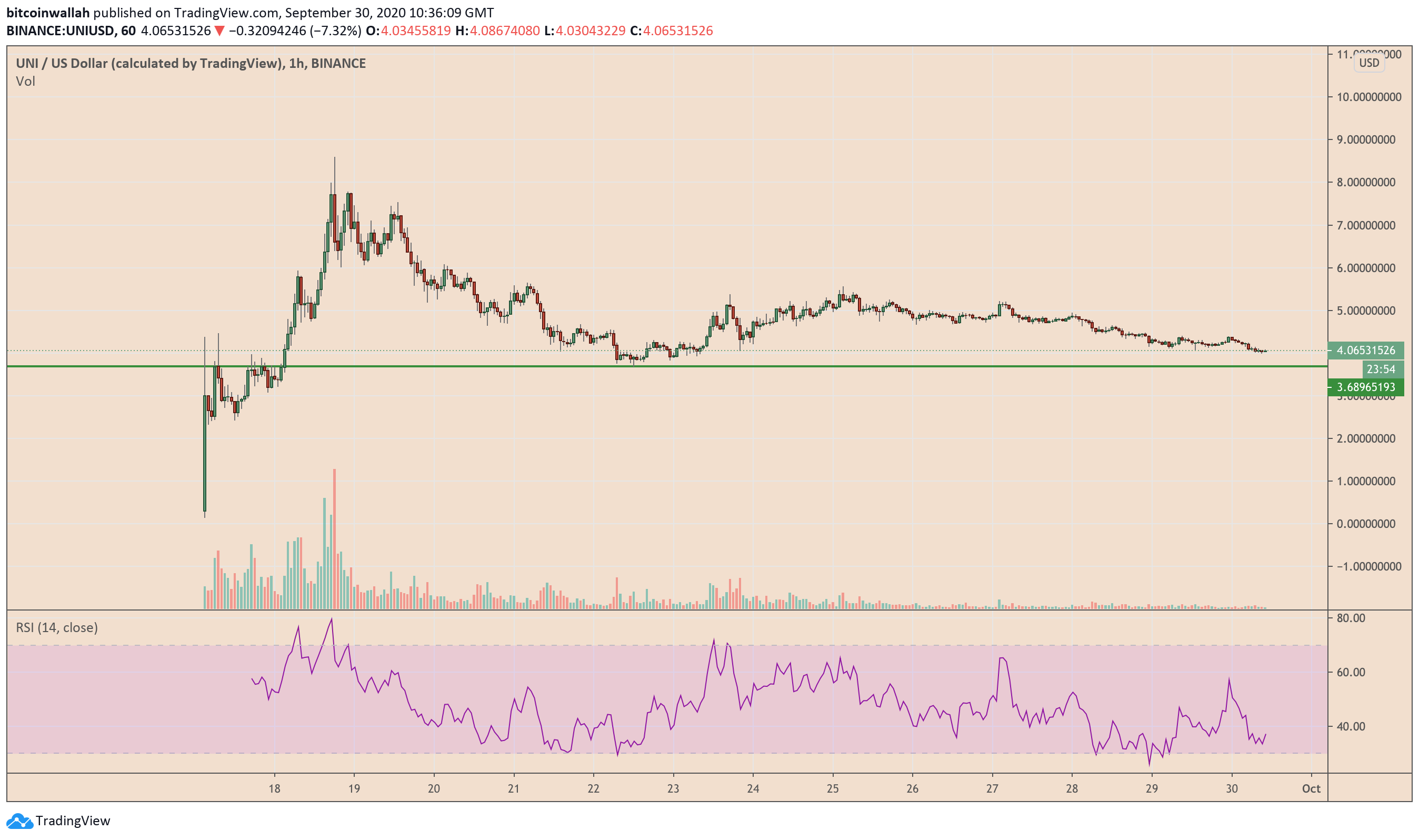 The UniSwap exchange’s governance cryptocurrency plunged by another 5 percent on Wednesday, hitting an intraday low of $4 as of 0900 UTC. The latest sell-off came as a part of a broader correction trend that followed UNI’s 5,524 percent price rally to an all-time high at $8.59.