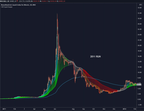 Let’s take a look at the previous Bitcoin cycles. Starting with the 2011 run, here is how the Super Guppy chart looked like: