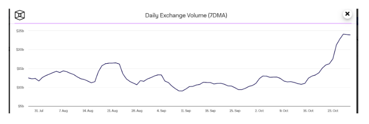 The recent boom in Bitcoin and cryptocurrency prices pushed Bitcoin daily trading volumes on crypto exchanges to their highest level since March. According to The Block’s data dashboard, the seven-day moving average for spot exchange volumes across multiple exchanges hit $24.12 billion on Thursday and $23.98 billion on Friday, respectively. In comparison, Bitcoin trading volume on exchanges was at $11.02 billion on the first day of the month.