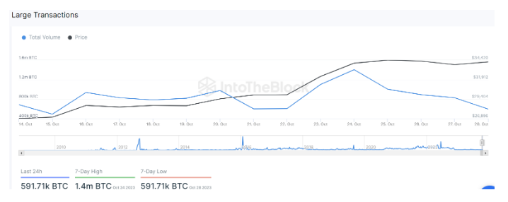A similar metric from IntoTheBlock shows Bitcoin transactions reaching 1.4 million BTC as bulls looked to push Bitcoin to $35,000.