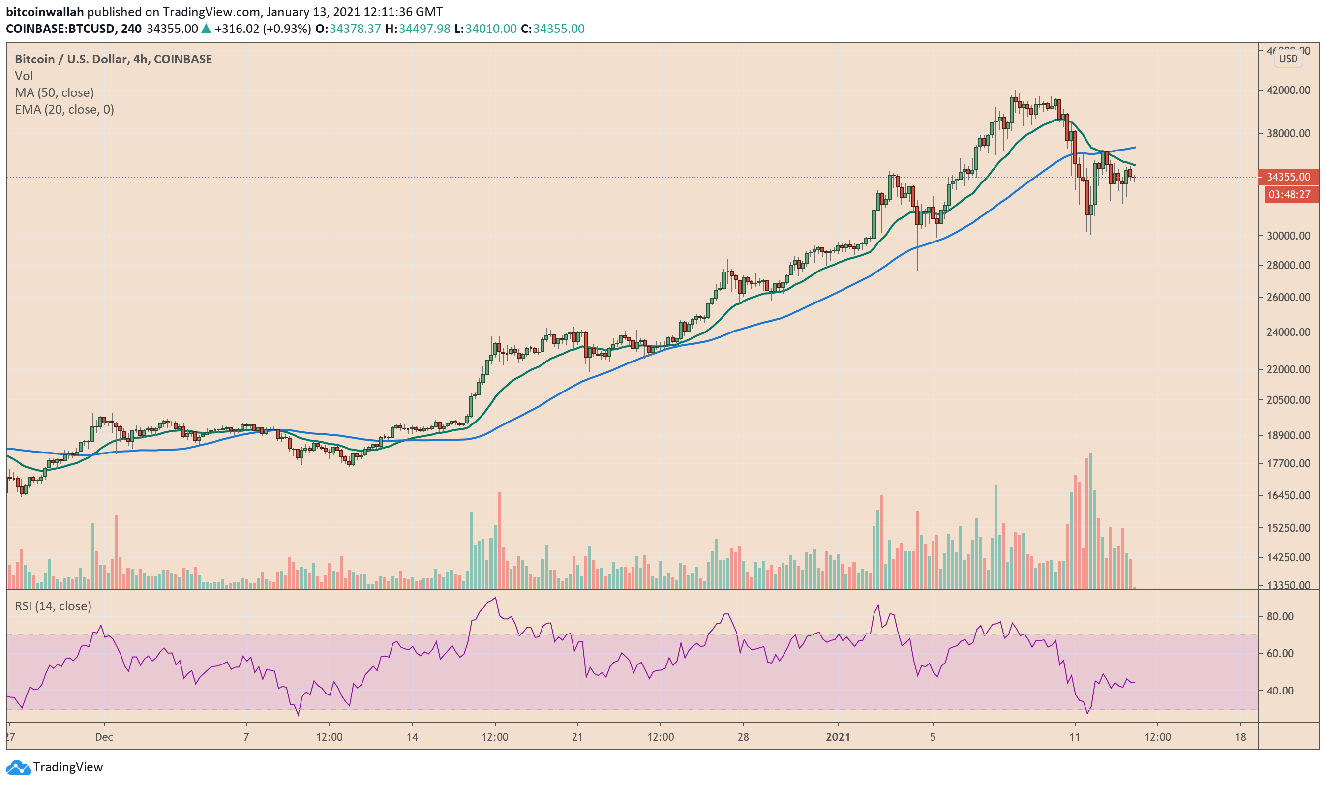 Bitcoin feels bearish sentiment under $35,000. Source: BTCUSD on TradingView.com