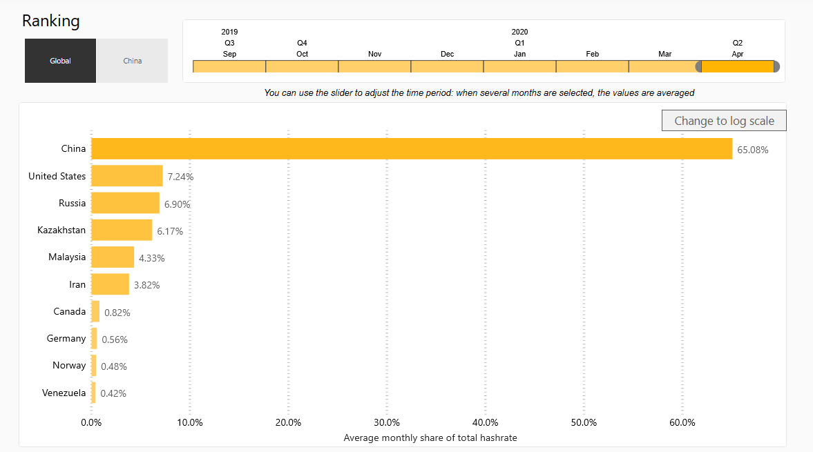 The latest data from the University of Cambridge, for April 2020, shows 65% of the Bitcoin hashing power came from China. The U.S. ranked second with 7.2%, and Russia third at 6.9%.