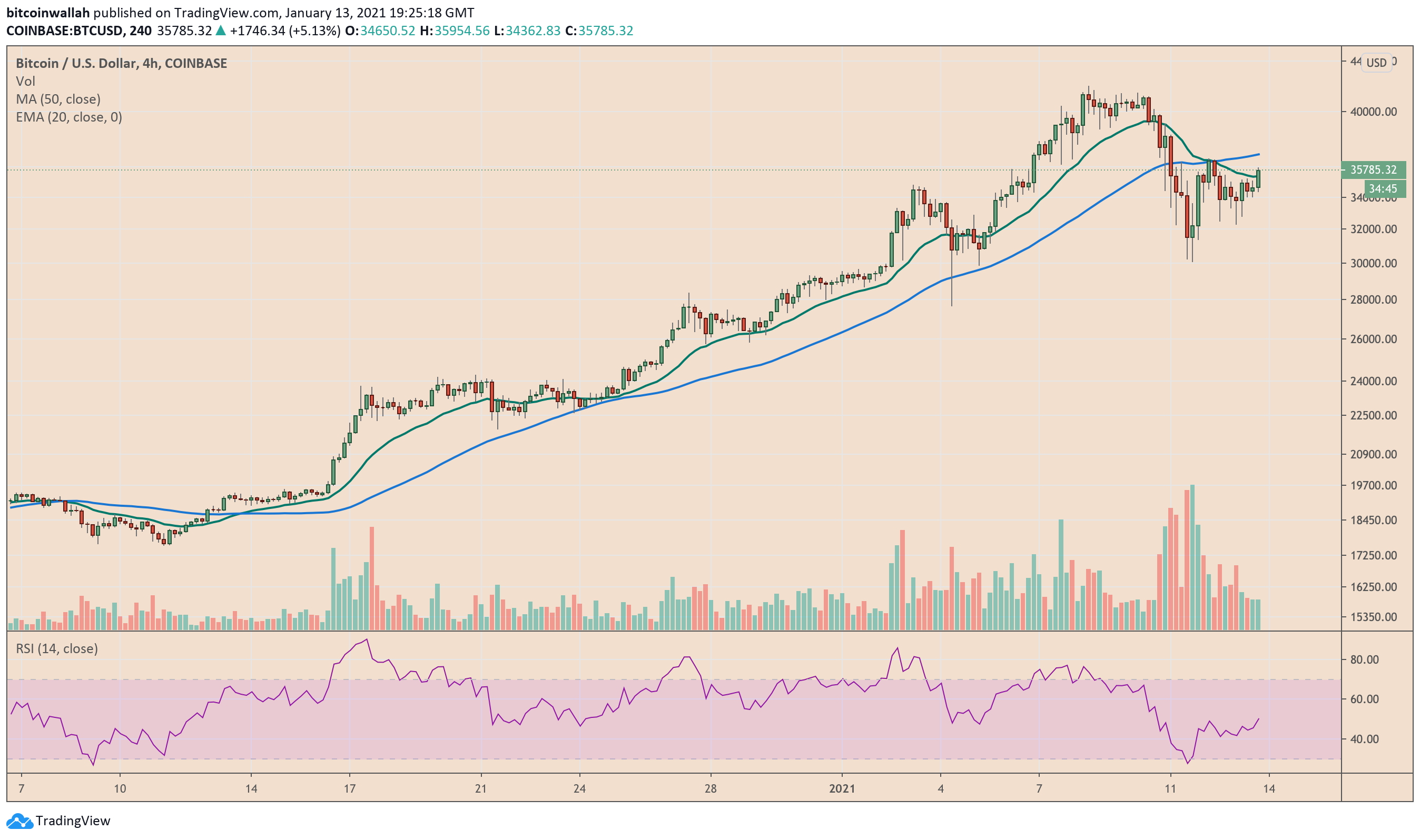 The BTC/USD exchange rate broke above its 20-day exponential moving average wave (green), signaling its desire to log a rebound towards its 50-day simple moving average (blue), followed by a breakout towards its all-time high above $42,000.