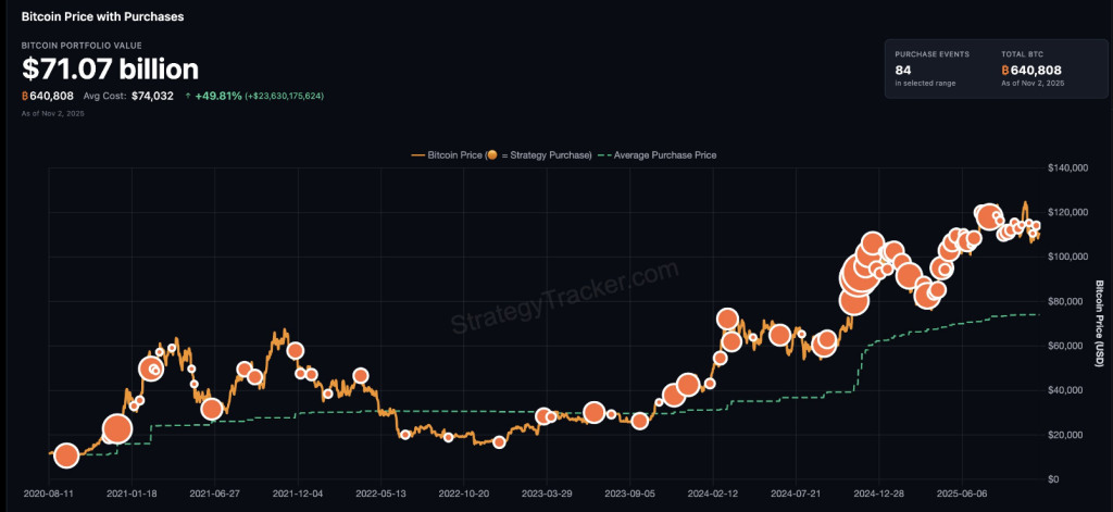 Based on reports and filings summarized in market coverage, Strategy currently holds roughly 640,808 BTC, with an average cost basis near $74,302 per coin.