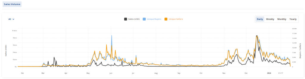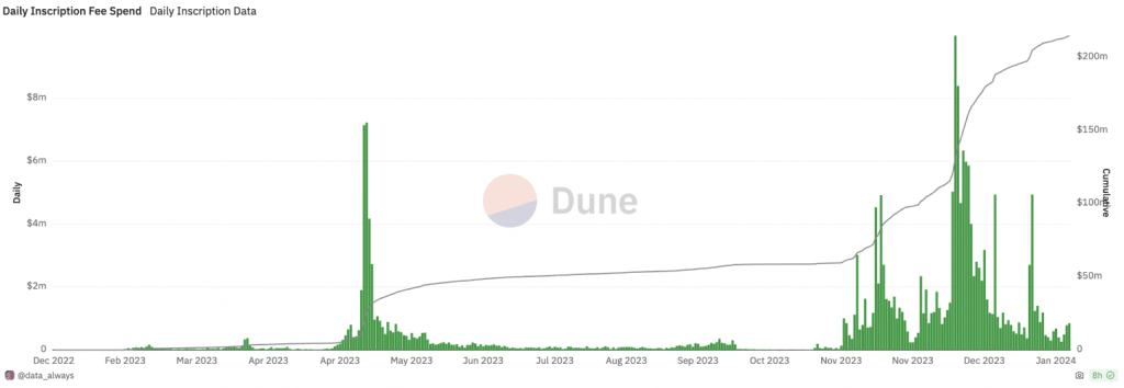This shift can be attributed to the fading fervor surrounding Ordinals, a technology enabling inscriptions and non-fungible tokens directly on the Bitcoin blockchain. The December surge in Bitcoin NFT activity was largely driven by Ordinals-related hype, leading to high fees for inscription minting. For instance, on December 10th, Bitcoin saw a single-day high fee of $10 million due to inscription transactions.