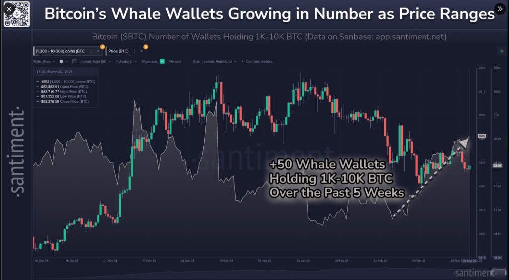 🐳 Bitcoin’s market value has fluctuated between $81K to $84K Monday. And while prices continue ranging as March draws to a close, whale wallets (specifically 1K-10K $BTC holders) continue growing in number.