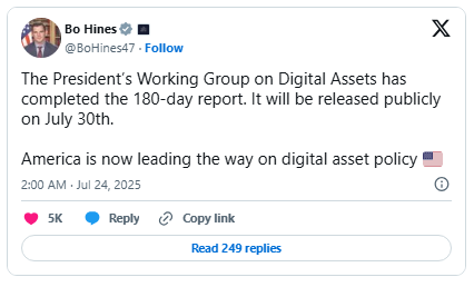 According to an X post by Bo Hines, the President’s Digital Asset Working Group wrapped up its 180‑day study and will publish the findings on July 30.