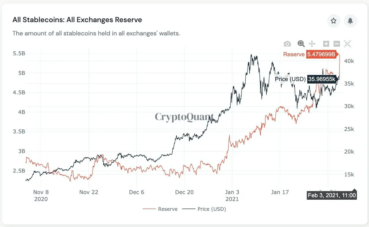 Data fetched by blockchain analytics platform, CryptoQuant, showed exchanges’ stablecoins reserves hitting a record high of 5.47 billion after adding $600 million in a day. The spike apprehensively coincided with a modest upside move in the Bitcoin market, wherein the BTC/USD exchange rate rose by almost 3 percent to hit an intraday high of $36,888.