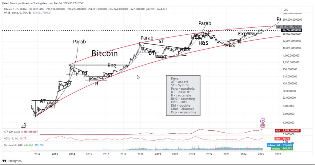 Unless Bitcoin has escape velocity through upper parabolic resistance line it’s very unlikely that BTC will be trading above $200k at the end of this decade. Only☑️can reply. No interest in non- ☑️replies pic.twitter.com/7a5N7Gliw8— Peter Brandt (@PeterLBrandt) February 14, 2025