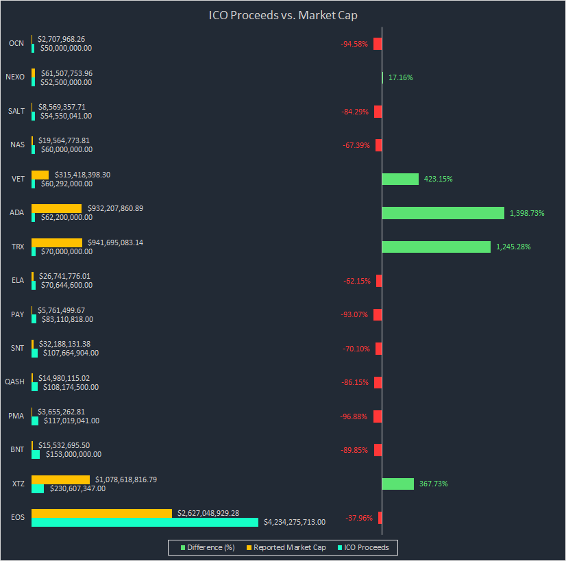 “Only 33% of tokens that raised at least $50mn trade at a market cap greater than their ICO proceeds,” he tweeted on Tuesday. “The tokens that had less public awareness seemed to have printed massive ROIs relative to their ICO sale price but are now down +95% from those prices. IOTA is one that comes to my mind.”