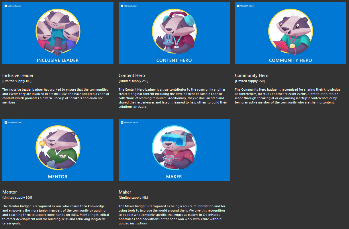 “Azure Heroes aims to reward individuals for verifiable acts of impact such as coaching, creating demos, building sample code, blogging about Azure or completing certain challenges. Community members that have demonstrated their contributions will be recognised with badges across a number of categories.”