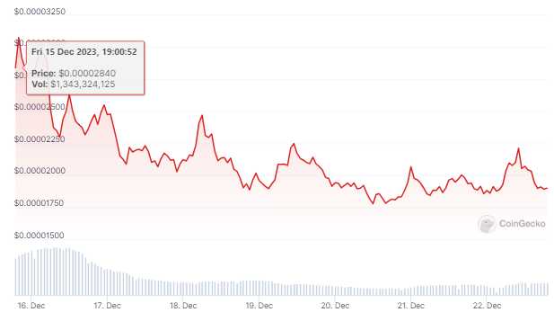 At the time of writing, the meme coin was trading at $0.000018, down 29% in the last 24 hours, and sustained a significant loss of 30.6 in the last seven days, data from Coingecko shows.