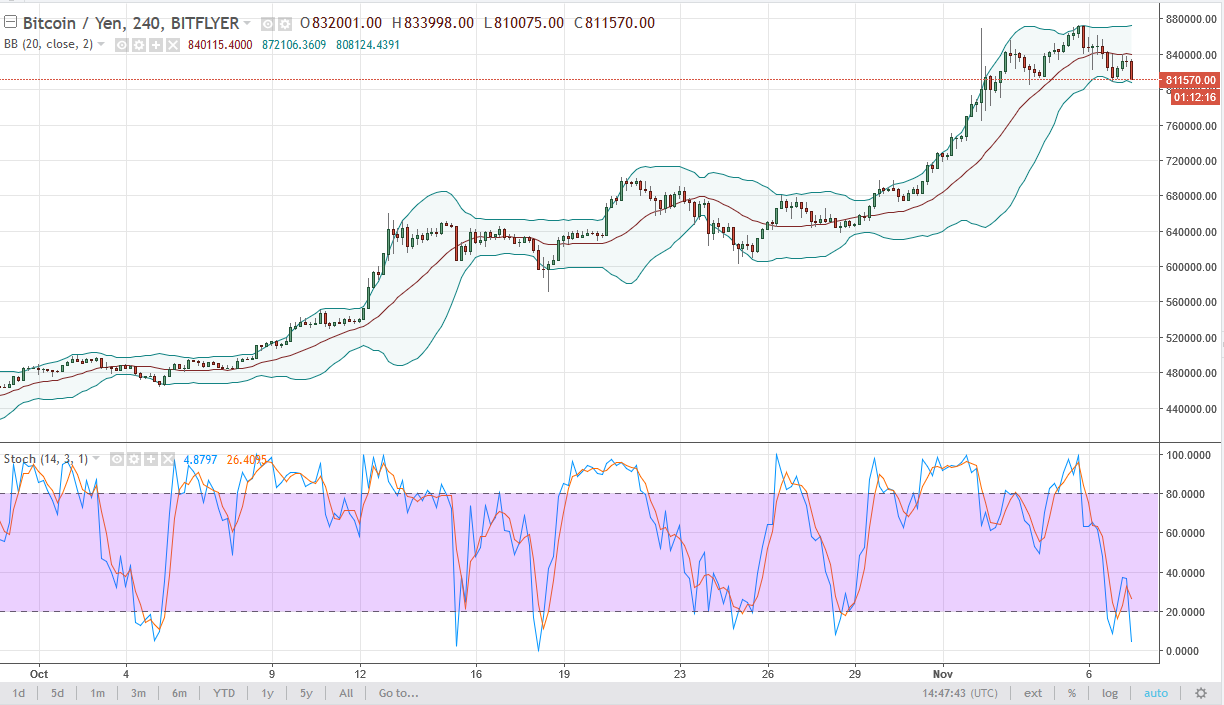 Bitcoin also fell against the Japanese yen, but quite frankly I think there’s plenty of support underneath, especially near the ¥720,000 level. Somewhere between here and there, expect a bounce that you can start taking advantage of. That should offer enough value to attract traders as we are reaching the bottom of the stochastic range, and a crossover should happen reasonably soon.