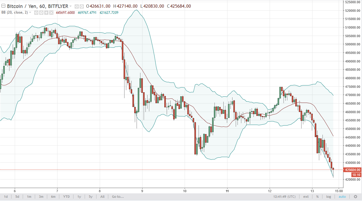 Bitcoin fell against the Japanese yen as well, testing the ¥420,000 level. By doing so, the market looks likely to continue to be very volatile, and I think at this point they move above the ¥450,000 level would be needed to stabilize the market. In the meantime, sellers probably are going to have their way.