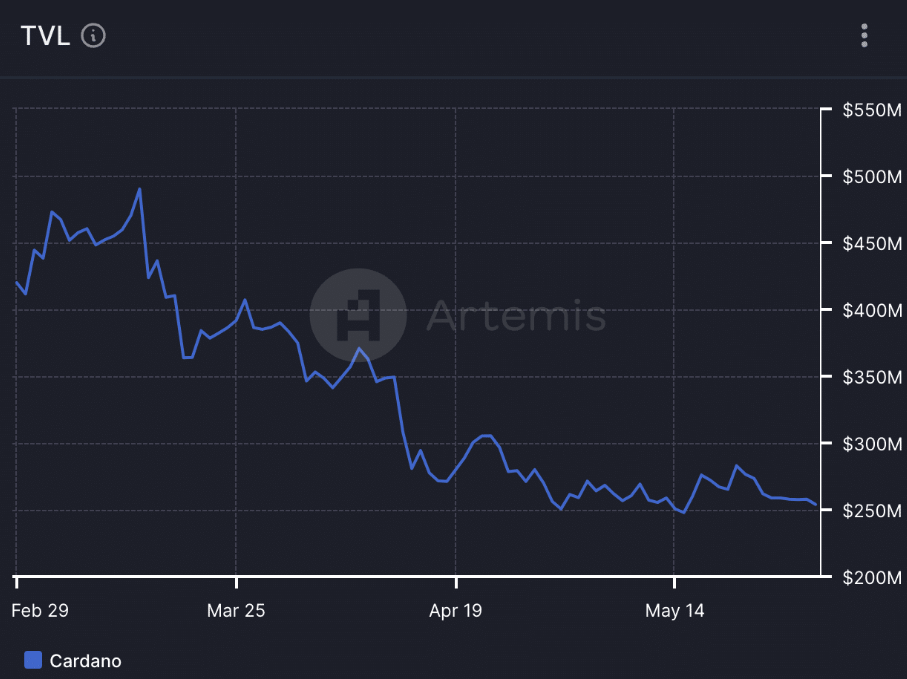 Data from Artemis, a top blockchain provider, shows that Cardano’s TVL has seen a notable dip from $430 million to $230 million despite the explosion in DEX volumes over the crypto scene. This implies a lack of interest in dApps developed on the Cardano network, therefore compromising its long-term development possibilities.