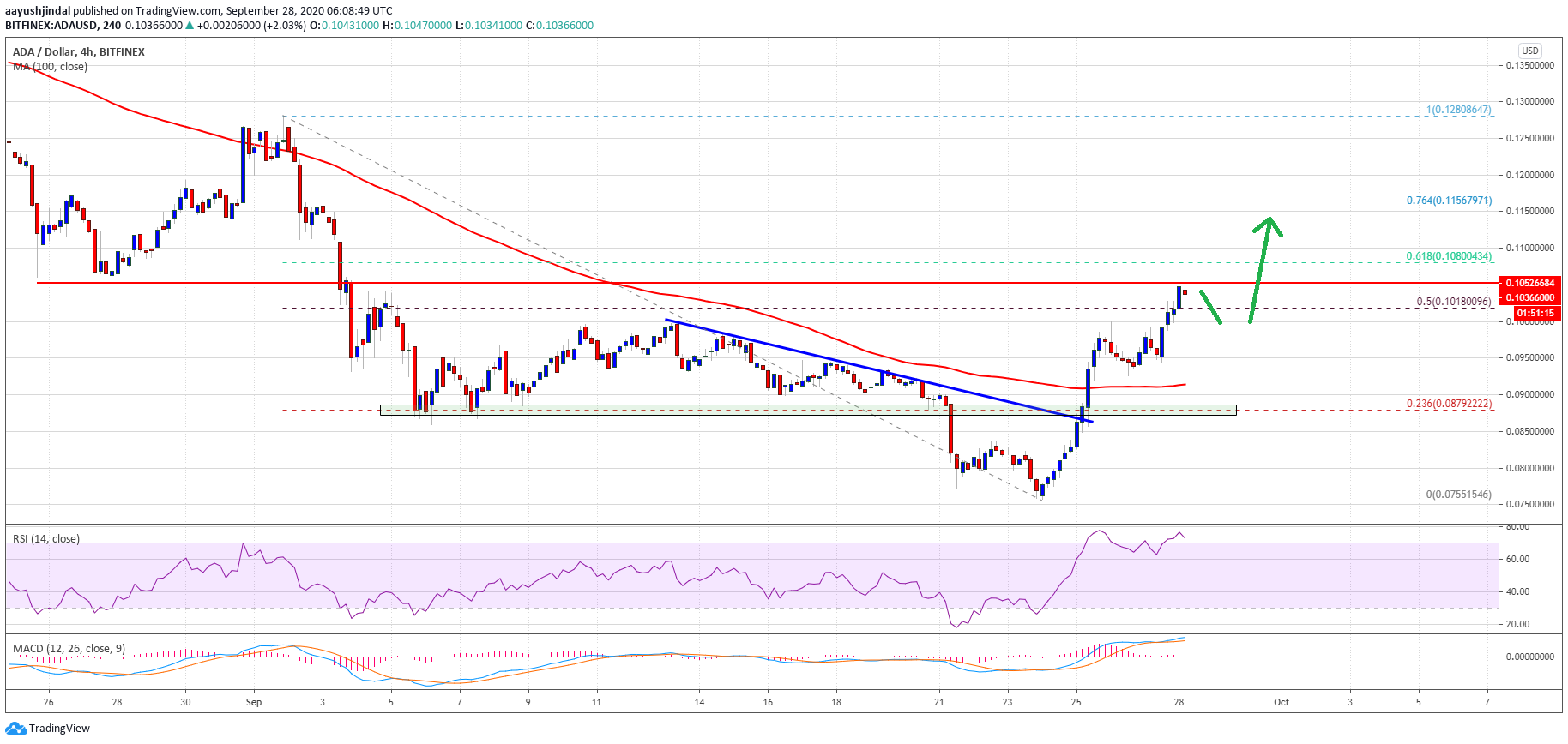 Cardano price broke the 50% Fib retracement level of the downward move from the $0.1280 high to $0.0755 low. The pair is now trading nicely above the $0.1000 resistance level.