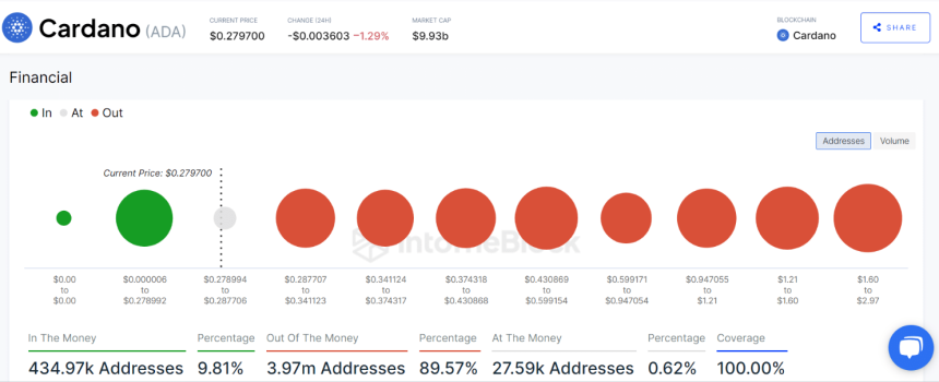 In an accompanying chart in the analysis that lays bare the current situation, it becomes evident that nearly 4 million ADA addresses find themselves in the unfortunate position of holding the cryptocurrency at a loss. This staggering figure represents approximately 89.7% of all ADA holders at the time of this report.