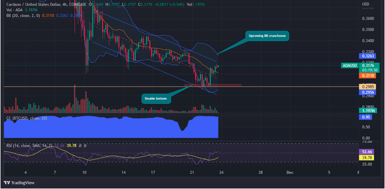 However, RSI values remain neutral. With the price action establishing a double bottom, however, a decline below $0.2985 remains probable.