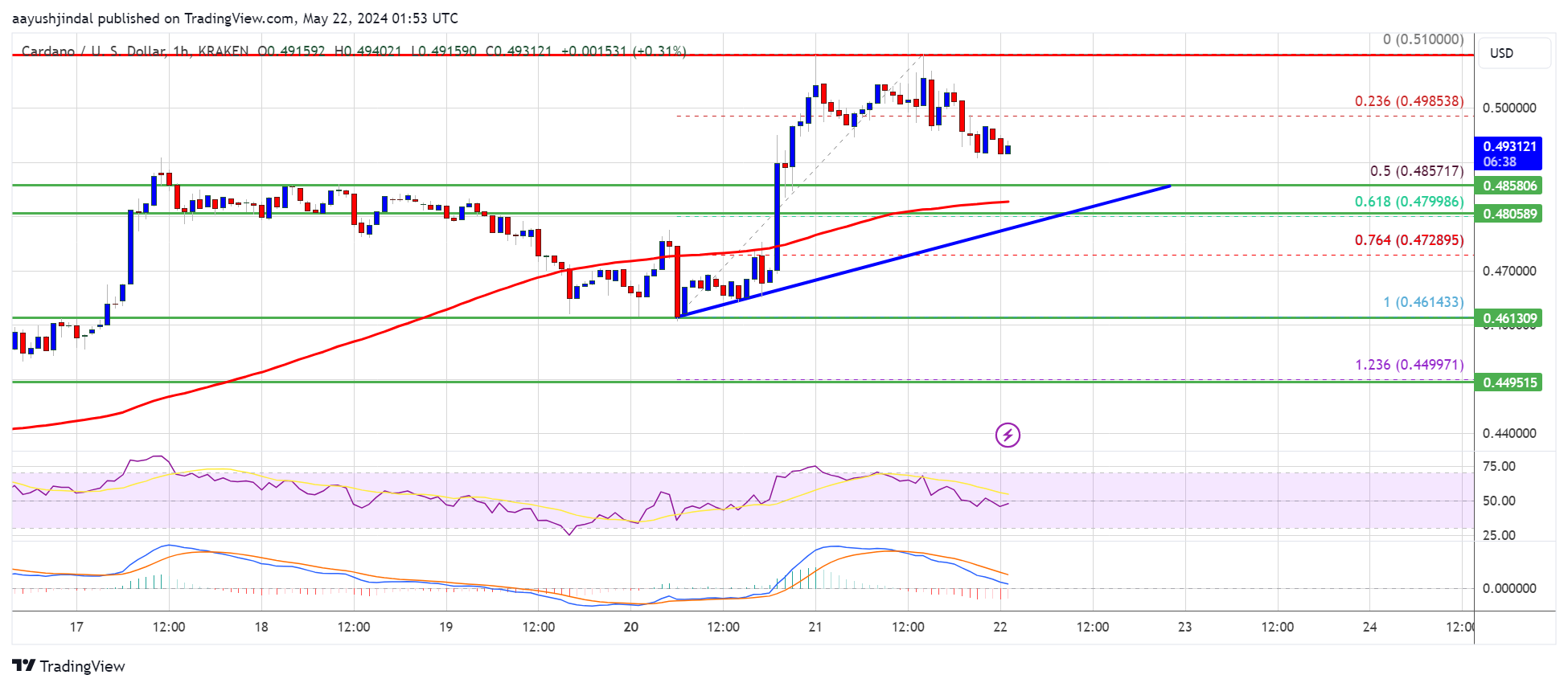 The price even spiked above $0.50 but it failed to continue higher. A high was formed at $0.510 and recently there was a downside correction. The price declined below the $0.4980 support. It dipped below the 23.6% Fib retracement level of the upward move from the $0.4614 swing low to the $0.510 low.