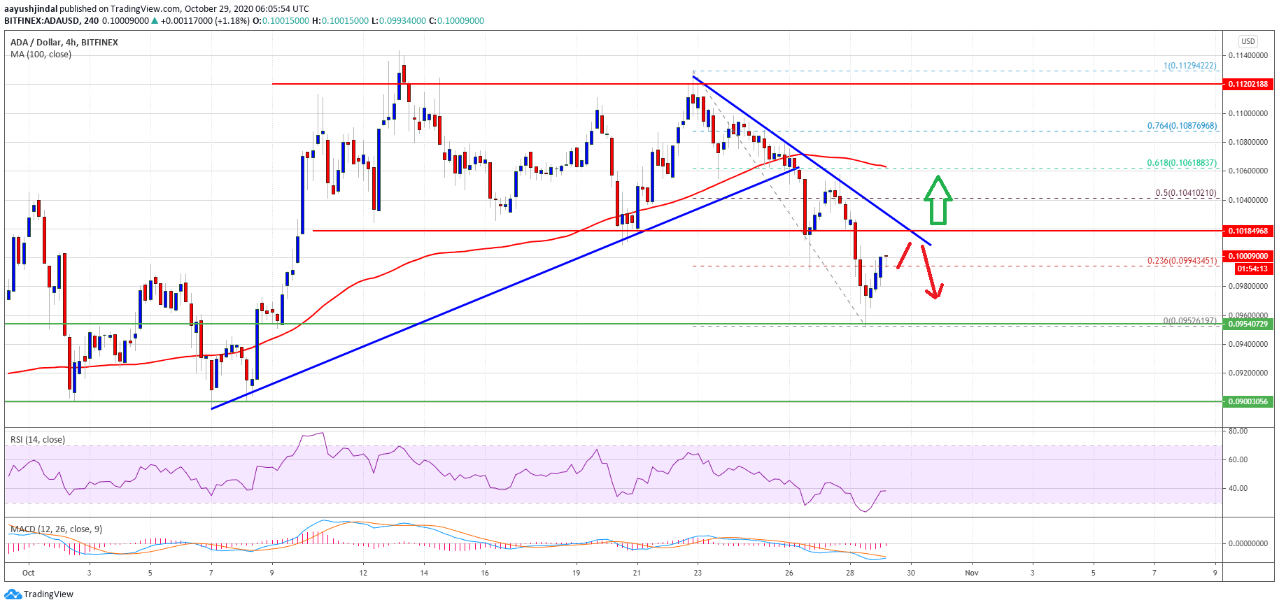 There is also a key bearish trend line forming with resistance near $0.1020 on the 4-hours chart of the ADA/USD pair. The trend line resistance is important near $0.1020 since it represents the previous breakdown zone. The next major resistance is near the $0.1040 level.