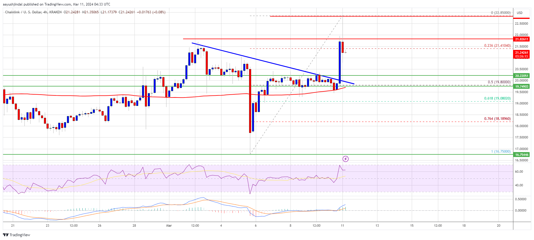 LINK is now trading above the $20.50 level and the 100 simple moving average (4 hours). The price is up over 5% and outpacing both Bitcoin and Ethereum. If the bulls remain in action, the price could rise further. Immediate resistance is near the $21.80 level.