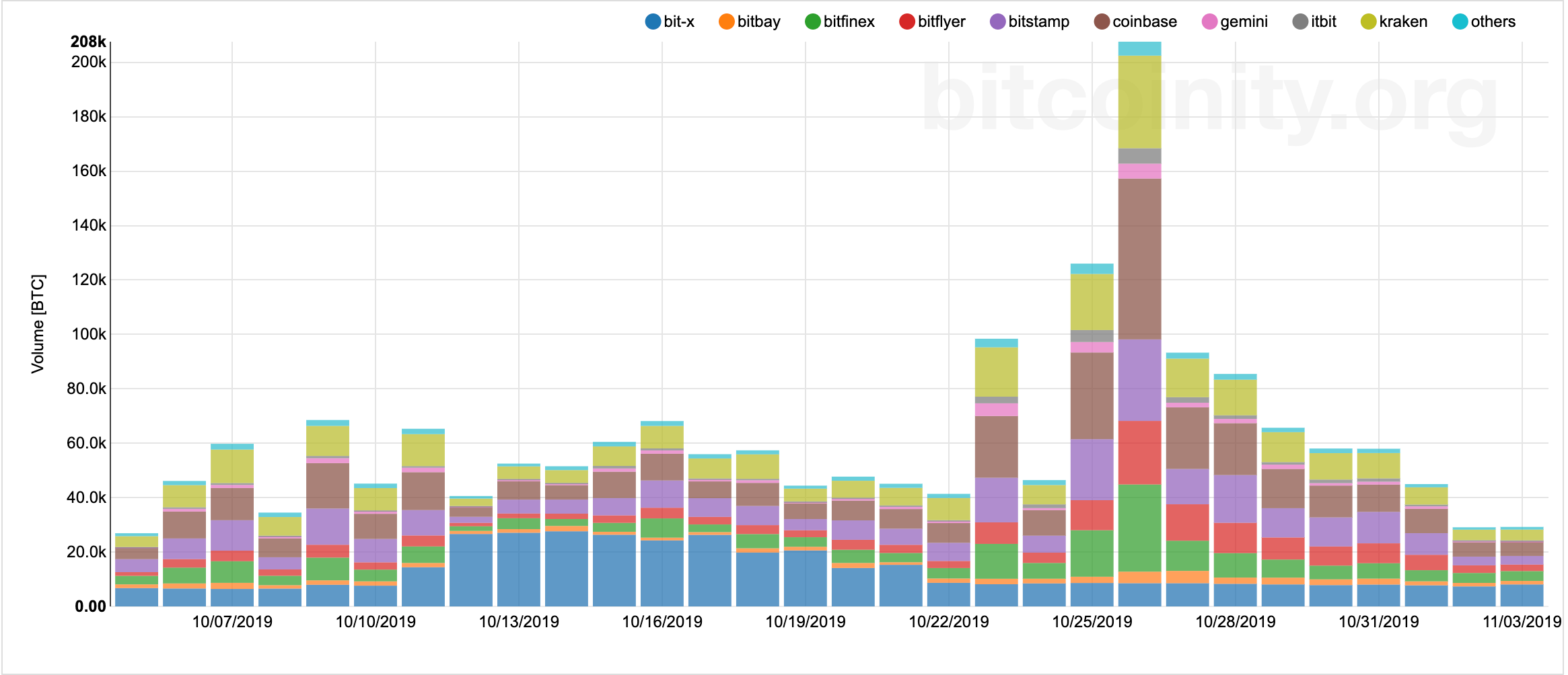 Trading data aggregator Bitcoinity shows a similar picture. On October 25, the total bitcoin trades recorded across all the cryptocurrency exchanges were 126,032. The next day, when the bitcoin price surged by circa $600, the total trades too climbed to 207,608. Nevertheless, the figures started declining thereafter, trending downwards as each day passed. The bitcoin price also started trending sideways within the same period – from October 28 until the press time, as shown in the chart below.