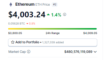 Ether breaking past the $4k barrier. Source: Coingecko
