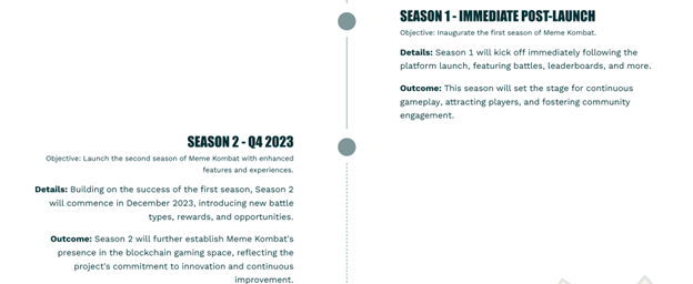 Meme Kombat has planned five stages for its roadmap; the initial stage is the presale launch, followed by the platform launch after the presale sells out. Looking ahead, the project will feature two seasons in sequence, with season 1 launching immediately, providing exciting battles and leaderboards.