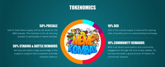 Moving to its tokenomics, 50% of $MK tokens will be available in the presale, 10% are allocated to DEX liquidity, 30% to staking and battle rewards, and 10% to community engagement.