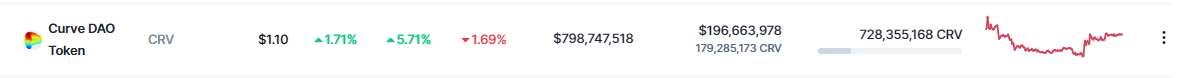 According to CoinMarketCap, CRV price is up by 5.7% in the last 24 hours or trading at $1.10 at the time of writing. This appears to be in complete contrast to the general market sentiment that is showing some consolidation.